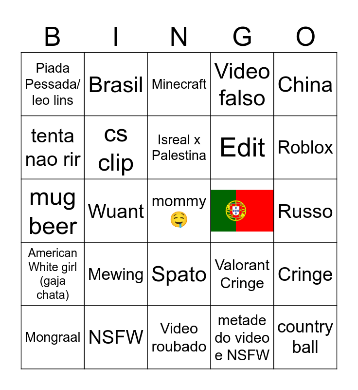 This bingo card has 1 images, a free space and 23 words: Mewing, NSFW, Isreal x Palestina, Mongraal, China, Piada Pessada/ leo lins, tenta nao rir, Brasil, Spato, Edit, mug beer, Valorant Cringe, Cringe, cs clip, metade do video e NSFW, Russo, Minecraft, Roblox, Wuant, country ball, American White girl (gaja chata), Video falso and Video roubado.