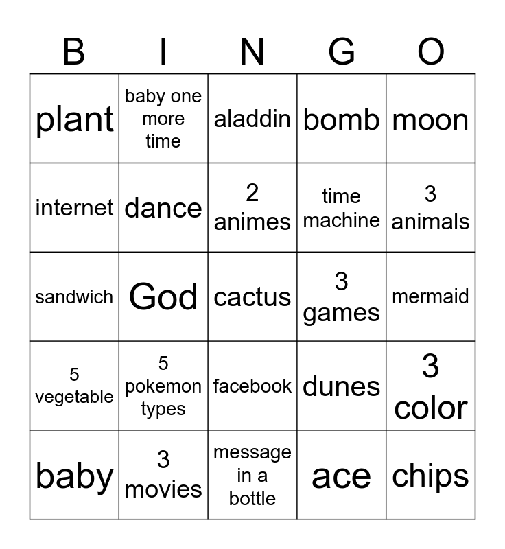This bingo card has a free space and 24 words: 5 pokemon types, 3 movies, 2 animes, baby, moon, plant, internet, baby one more time, 3 games, facebook, time machine, sandwich, dunes, 3 color, dance, ace, mermaid, aladdin, 3 animals, God, chips, 5 vegetable, bomb and message in a bottle.