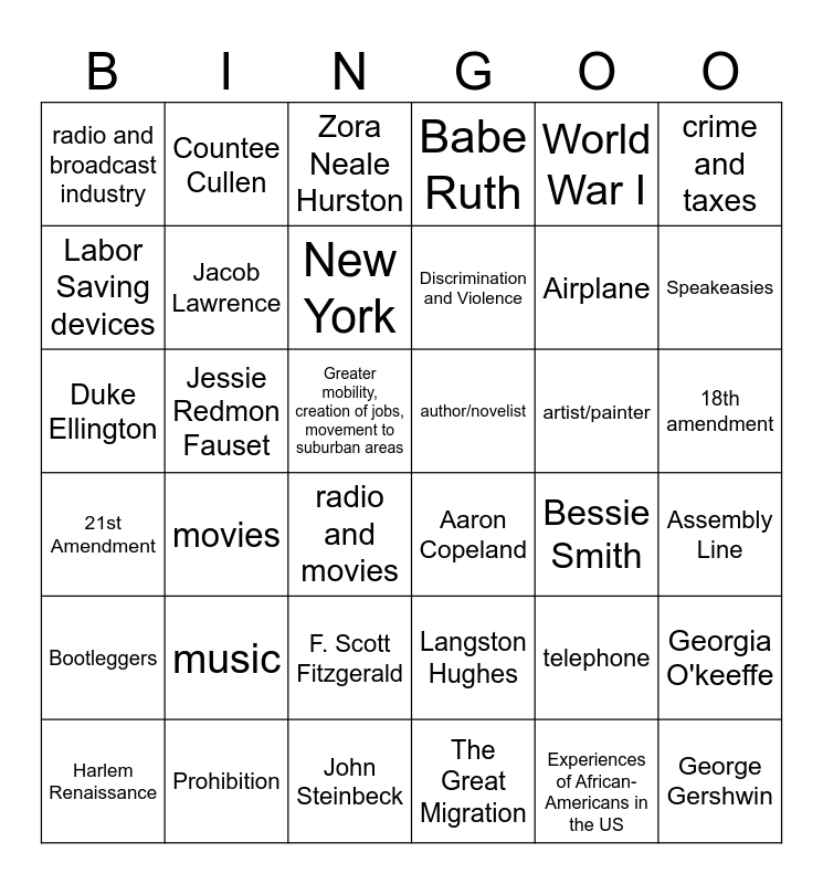 This bingo card has 36 words: Langston Hughes, F. Scott Fitzgerald, The Great Migration, Labor Saving devices, 21st Amendment, author/novelist, Jacob Lawrence, John Steinbeck, World War I, telephone, Speakeasies, Babe Ruth, Georgia O'keeffe, Jessie Redmon Fauset, Discrimination and Violence, radio and broadcast industry, Bootleggers, artist/painter, Duke Ellington, Zora Neale Hurston, Greater mobility, creation of jobs, movement to suburban areas, movies, Aaron Copeland, radio and movies, Bessie Smith, Countee Cullen, Airplane, Prohibition, New York, crime and taxes, George Gershwin, Harlem Renaissance, Assembly Line, 18th amendment, music and Experiences of African-Americans in the US.