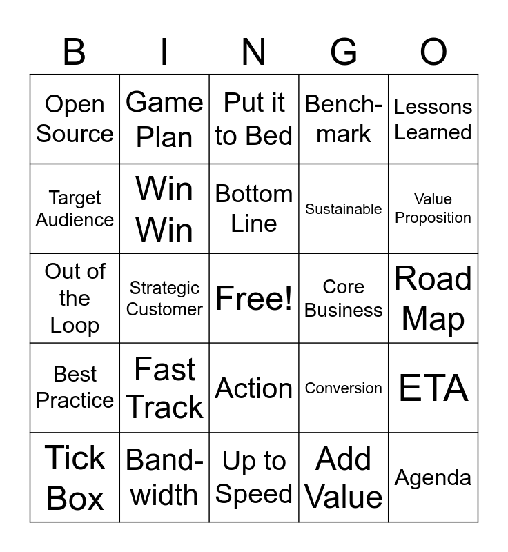 This bingo card has a free space and 34 words: Leading Edge, Add Value, Show-stopper, Outside The Box, Best Practice, Win Win, Lessons Learned, Tick Box, Game Plan, Metric, Bottom Line, Put it to Bed, Paradigm, At the end of the day, Core Business, Value Proposition, Band-width, Out of the Loop, Fast Track, Conversion, Action, Circle Back, Open Source, Road Map, Up to Speed, Agenda, Bench-mark, Go Live, Sustainable, Target Audience, Low Hanging Fruit, Strategic Customer, ETA and Offline.