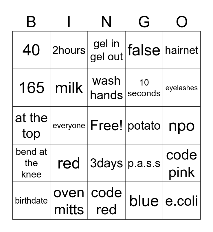 This bingo card has a free space and 24 words: red, oven mitts, wash hands, birthdate, hairnet, 40, 165, 2hours, potato, 3days, 10 seconds, at the top, p.a.s.s, code pink, milk, blue, npo, gel in gel out, eyelashes, everyone, e.coli, bend at the knee, false and code red.