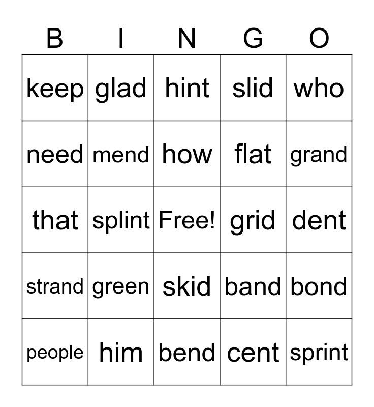This bingo card has a free space and 24 words: green, him, how, people, who, keep, need, glad, grid, skid, flat, that, band, bond, mend, cent, dent, hint, grand, splint, sprint, strand, slid and bend.