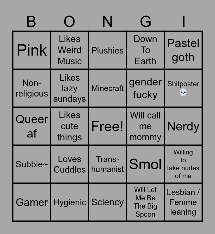 This bingo card has a free space and 24 words: Gamer, Loves Cuddles, Minecraft, Will Let Me Be The Big Spoon, Pastel goth, Pink, Likes Weird Music, Plushies, Will call me mommy, Nerdy, Queer af, Likes lazy sundays, Smol, Willing to take nudes of me, Non-religious, Hygienic, Sciency, Down To Earth, Shitposter 💀, Subbie~, Likes cute things, Trans-humanist, gender fucky and Lesbian / Femme leaning.