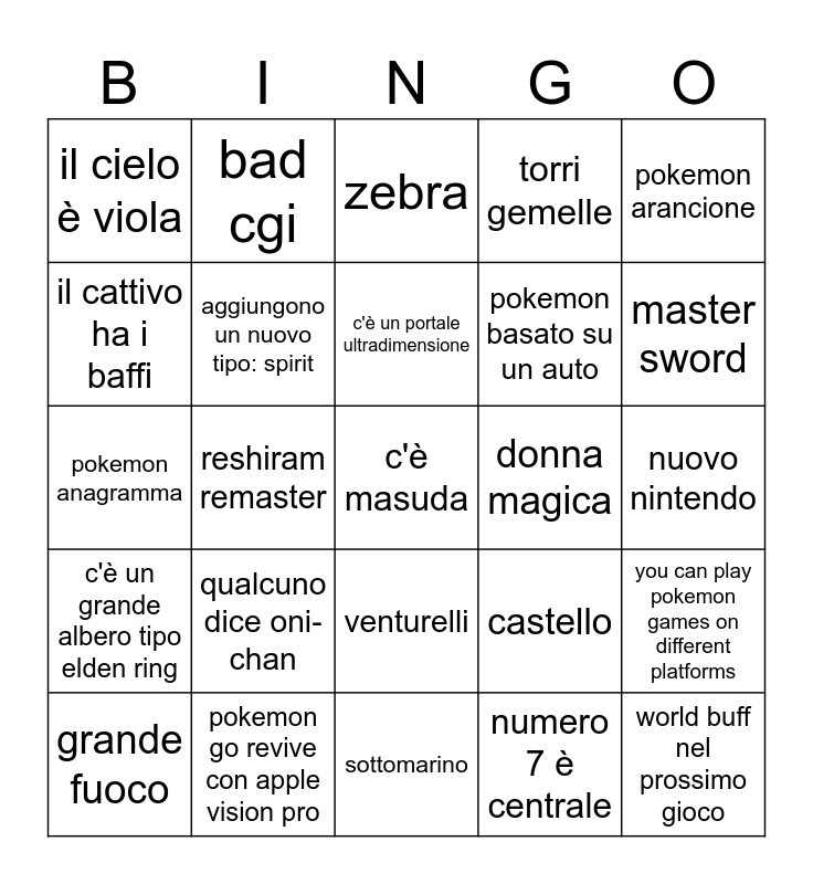 This bingo card has a free space and 24 words: qualcuno dice oni-chan, pokemon go revive con apple vision pro, c'è un portale ultradimensione, grande fuoco, pokemon arancione, il cielo è viola, il cattivo ha i baffi, bad cgi, donna magica, venturelli, pokemon basato su un auto, pokemon anagramma, castello, you can play pokemon games on different platforms, aggiungono un nuovo tipo: spirit, numero 7 è centrale, nuovo nintendo, zebra, master sword, reshiram remaster, world buff nel prossimo gioco, c'è un grande albero tipo elden ring, torri gemelle and sottomarino.