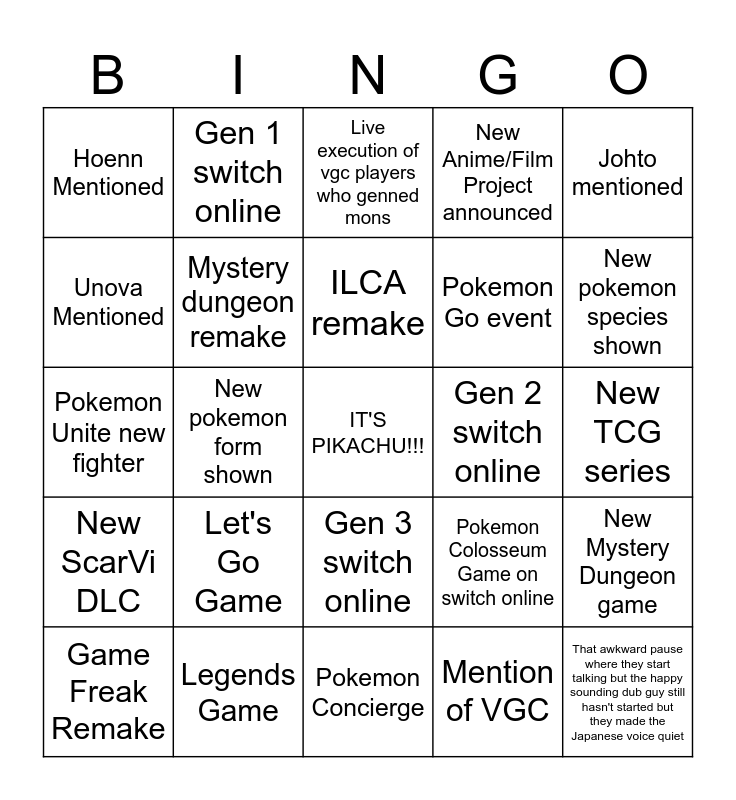 This bingo card has a free space and 24 words: Let's Go Game, Legends Game, ILCA remake, Game Freak Remake, Johto mentioned, Hoenn Mentioned, Unova Mentioned, Gen 1 switch online, Gen 2 switch online, Gen 3 switch online, Pokemon Go event, Pokemon Unite new fighter, Pokemon Colosseum Game on switch online, New Mystery Dungeon game, Mystery dungeon remake, Mention of VGC, New TCG series, Live execution of vgc players who genned mons, New pokemon species shown, New pokemon form shown, That awkward pause where they start talking but the happy sounding dub guy still hasn't started but they made the Japanese voice quiet, New ScarVi DLC, New Anime/Film Project announced and Pokemon Concierge.