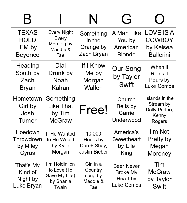 This bingo card has a free space and 83 words: Last Night by Morgan Wallen, Fast Car by Luke Combs, Something in the Orange by Zach Bryan, Tennessee Whiskey by Chris Stapleton, I Remember Everything by Zach Bryan, Kacey Musgraves, Life is a Highway by Rascal Flatts, Before He Cheats by Carrie Underwood, The Kind of Love we Make by Luke Combs, Jolene by Dolly Parton, 9 to 5 by Dolly Parton, Thinkin’ Bout Me by Morgan Wallen, Country Girl (Shake it For Me) by Luke Bryan, Dial Drunk by Noah Kahan, Church Bells by Carrie Underwood, Up Down by Morgan Wallen, Florida Georgia Line, TEXAS HOLD ‘EM by Beyonce, That’s My Kind of Night by Luke Bryan, Heading South by Zach Bryan, Beautiful Crazy by Luke Combs, Wild Ones by Jessie Murph, Jelly Roll, Love Story by Taylor Swift, Our Song by Taylor Swift, Tim McGraw by Taylor Swift, Picture to Burn by Taylor Swift, Something Like That by Tim McGraw, Need You Now by Lady A, Highway Don’t Care by Tim McGraw, Taylor Swift Keith Urwen, When I Go by Dylan Conrique, I Like the Sound of That by Rascal Flatts, Tequila by Dan + Shay, If He Wanted to He Would by Kylie Morgan, Play It Again by Luke Bryan, I only Date Cowboys by Kylie Morgan, Hometown Girl by Josh Turner, Bridesmaids by Kylie Morgan, Take It From Me by Jordan Davis, Girl in a Country song by Maddie & Tae, No Place Like You by Maddie & Tae, When it Rains it Pours by Luke Combs, Hoedown Throwdown by Miley Cyrus, God’s Country by Blake Shelton, Purple Irises by Gwen Stefani, Blake Shelton, Nothing Breaks Like a Heart by Mark Ronson, Miley Cyrus, Old Town Road by Lil Nas X, Billy Ray Cyrus, Wasted by Carrie Underwood, Achy Breaky Heart by Billy Ray Cyrus, Every Night Every Morning by Maddie & Tae, I Want My Mullet Back by Billy Ray Cyrus, The Gambler by Kenny Rogers, Back To Tennessee by Billy Ray Cyrus, America’s Sweetheart by Elle King, A Man Like You by American Blonde, Islands in the Stream by Dolly Parton, Kenny Rogers, Roll That Rock by Billy Ray Cyrus, Bobby & Teddi Cyrus, Why Girl by American Blonde, Man! I Feel Like a Woman! by Shania Twain, You’re Still The One by Shania Twain, UNHEALTHY by Anne-Marie, Shania Twain, I’m Holdin’ on to Love (To Save My Life) by Shania Twain, Love Gets Me Every Time by Shania Twain, Not Just a Girl by Shania Twain, Hole in the Bottle by Kelsea Ballerini, Shamia Twain, Peter Pan by Kelsea Ballerini, LOVE IS A COWBOY by Kelsea Ballerini, Love Me Like You Mean It by Kelsea Ballerini, I’m Not Pretty by Megan Moroney, Tennessee Orange Megan Moroney, But I Got a Beer in my Hand by Luke Bryan, Forever After All by Luke Combs, Whiskey Glasses by Morgan Wallen, Always Gonna Be by Dan + Shay, Tie It Up by Kelly Clarkson, Don’t Take the Girl by Tim McGraw, 10,000 Hours by Dan + Shay, Justin Bieber, Beer Never Broke My Heart by Luke Combs, Meant to Be by Bebe Rexha, Florida Georgia Line, Stop Draggin’ Your Boots by Danielle Bradbery, If I Know Me by Morgan Wallen, Stick Season by Noah Kahan, 5,6,7,8 by Steps, Cotton Eye Joe by Rednex, Hurricane by Luke Combs and She Got the Best of Me by Luke Combs.