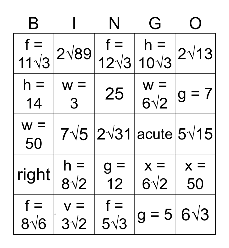 This bingo card has 1 images, a free space and 30 words: v = 3√2, x = 11√2, 7√5, v = 22, f = 11√3, f = 12√3, w = 3, g = 12, acute, f = 5√3, 5√15, 6√3, g = 5, h = 22, g = 7, obtuse, x = 6√2, right, h = 8√2, 2√13, w = 50, g = 5√3, 2√89, w = 6√2, h = 14, h = 10√3, x = 50, f = 8√6, 25 and 120.
