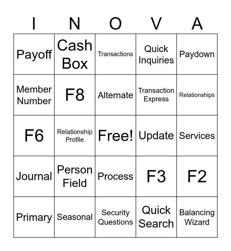 This bingo card has a free space and 24 words: Person Field, Seasonal, Alternate, Primary, Paydown, Payoff, Member Number, Cash Box, Update, Process, Transaction Express, F6, F3, F2, F8, Quick Search, Services, Transactions, Relationships, Relationship Profile, Balancing Wizard, Journal, Quick Inquiries and Security Questions.