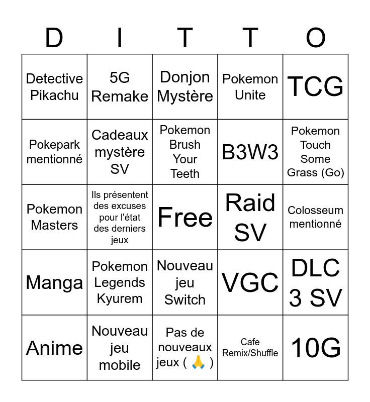 This bingo card has a free space and 24 words: Pokemon Legends Kyurem, Nouveau jeu mobile, Pokemon Brush Your Teeth, Anime, TCG, Detective Pikachu, Pokepark mentionné, 5G Remake, Raid SV, Nouveau jeu Switch, B3W3, Pokemon Masters, VGC, DLC 3 SV, Cadeaux mystère SV, Cafe Remix/Shuffle, Colosseum mentionné, Donjon Mystère, Pokemon Touch Some Grass (Go), Ils présentent des excuses pour l'état des derniers jeux, 10G, Manga, Pokemon Unite and Pas de nouveaux jeux ( 🙏 ).
