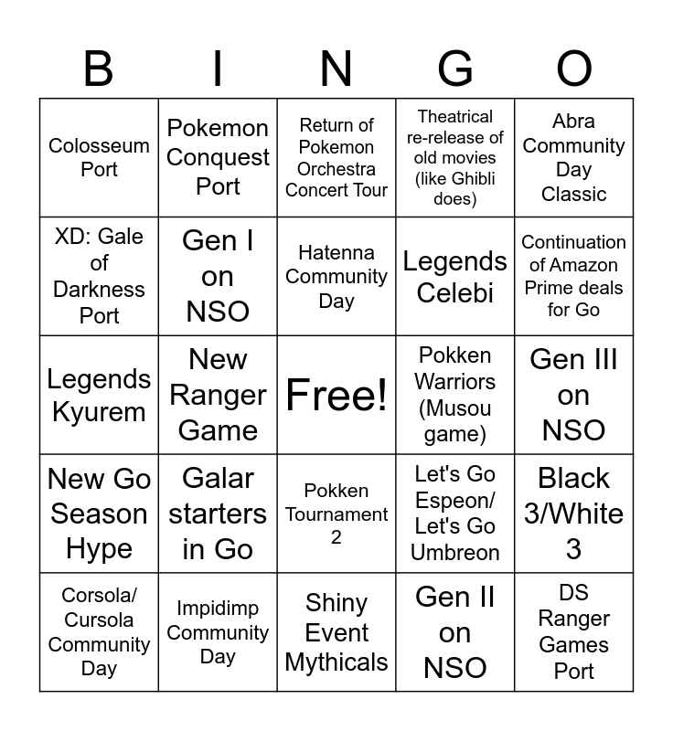 This bingo card has a free space and 24 words: Galar starters in Go, Impidimp Community Day, Hatenna Community Day, Corsola/ Cursola Community Day, Abra Community Day Classic, Colosseum Port, XD: Gale of Darkness Port, Pokemon Conquest Port, Pokken Warriors (Musou game), Pokken Tournament 2, Legends Celebi, Legends Kyurem, Let's Go Espeon/ Let's Go Umbreon, Black 3/White 3, Gen I on NSO, Gen II on NSO, Gen III on NSO, Return of Pokemon Orchestra Concert Tour, Continuation of Amazon Prime deals for Go, New Ranger Game, DS Ranger Games Port, New Go Season Hype, Theatrical re-release of old movies (like Ghibli does) and Shiny Event Mythicals.