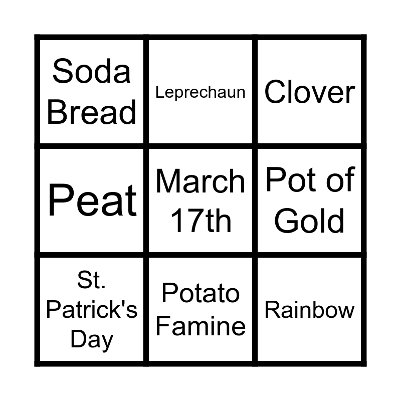 This bingo card has 32 words: Waterford, Green, Rainy, Jig, Parade, St. Patrick's Day, March 17th, Irish Eyes, Leprechaun, Blarney Stone, Potato Famine, Clover, Shamrock, Lad, Bog, Shenanigans, Spud, Ireland, Lass, Limerick, Emerald Isle, Harp, Hook Lighthouse, Pubs, Atlantic Ocean, Peat, Rainbow, Pot of Gold, Soda Bread, Dublin, Celtic and Luck.