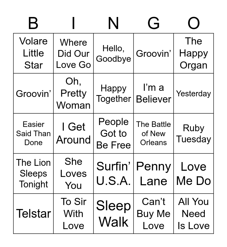 ⚠ This card has duplicate items: A Big Hunk o’ Love (2), All You Need Is Love (2), Aquarius/Let the Sunshine In (2), Big Bad John (2), Blue Velvet (2), Breaking Up Is Hard to Do (2), California Dreamin’ (2), Can’t Buy Me Love (2), Cherish (2), Come Softly to Me (2), Downtown (2), Easier Said Than Done (2), Good Vibrations (2), Groovin’ (2), Happy Together (2), Harper Valley P.T.A. (2), He’s So Fine (2), Hello, Goodbye (2), Help! (2), Hey Jude (2), Hey! Baby (2), Honey (2), House of the Rising Sun (2), I Can’t Help Myself (Sugar Pie Honey Bunch) (2), I Can’t Stop Loving You (2), I Get Around (2), I Heard It Through the Grapevine (2), I Want to Hold Your Hand (2), I’m a Believer (2), I’m Telling You Now (2), It’s All in the Game (2), It’s Only Make Believe (2), Judy in Disguise (With Glasses) (2), Kansas City (2), Light My Fire (2), Lonely Boy (2), Love Is Blue (2), Love Me Do (2), Mack the Knife (2), Monday, Monday (2), Mrs. Robinson (2), My Girl (2), Oh, Pretty Woman (2), Paint It, Black (2), Penny Lane (2), People Got to Be Free (2), Poor Little Fool (2), Reach Out I’ll Be There (2), Respect (2), Roses Are Red (My Love) (2), Ruby Tuesday (2), Runaround Sue (2), Runaway (2), Satisfaction (2), She Loves You (2), Sleep Walk (2), Smoke Gets in Your Eyes (2), Stagger Lee (2), Sugar Shack (2), Summer in the City (2), Surfin’ U.S.A. (2), Telstar (2), The Battle of New Orleans (2), The Happy Organ (2), The Lion Sleeps Tonight (2), The Three Bells (2), The Twist (2), This Guy’s in Love With You (2), To Sir With Love (2), Tom Dooley (2), Venus (2), Volare Little Star (2), Where Did Our Love Go (2), Will You Love Me Tomorrow (2), Winchester Cathedral (2), Wooly Bully (2), Yesterday (2), You’ve Lost That Lovin’ Feelin’ (2)