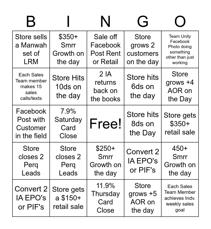This bingo card has a free space and 24 words: Convert 2 IA EPO's or PIF's, Store closes 2 Perq Leads, 2 IA returns back on the books, Store grows +5 AOR on the day, Team Unity Facebook Photo doing something other than just working, Store sells a Manwah set of LRM, $350+ Smrr Growth on the day, Sale off Facebook Post Rent or Retail, Store hits 8ds on the Day, Store gets $350+ retail sale, Facebook Post with Customer in the field, Store Hits 10ds on the day, Convert 2 IA EPO's or PIF's, 450+ Smrr Growth on the day, Each Sales Team member makes 15 sales calls/texts, Store gets a $150+ retail sale, 11.9% Thursday Card Close, Store grows 2 customers on the day, Store grows +4 AOR on the Day, Store closes 2 Perq Leads, 7.9% Saturday Card Close, $250+ Smrr Growth on the day, Store hits 6ds on the day and Each Sales Team Member achieves Indv. weekly sales goal.