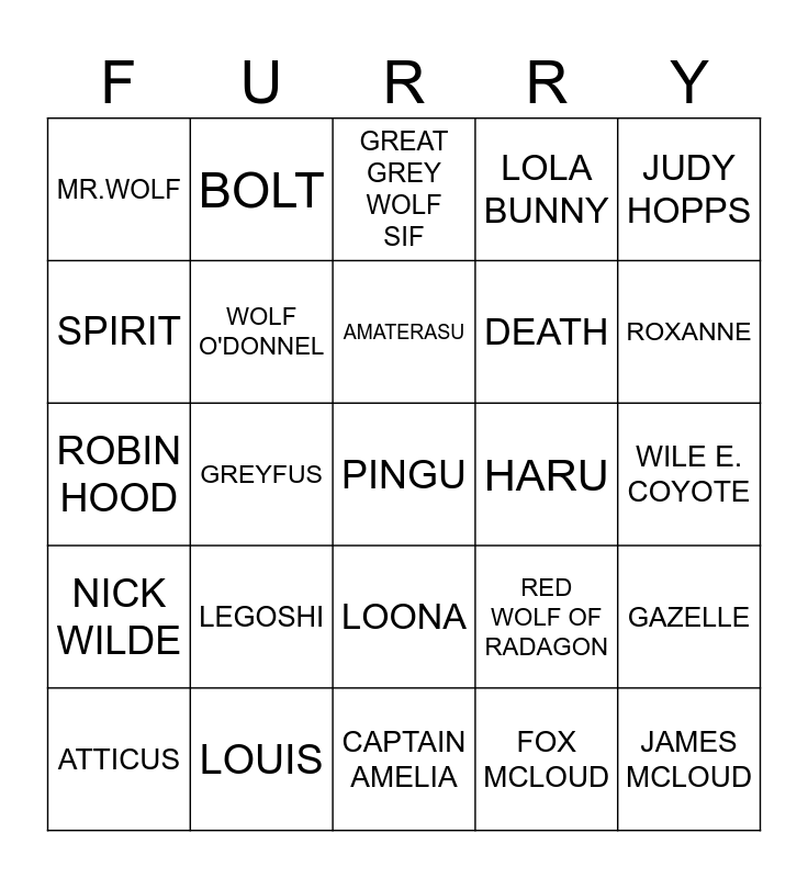 This bingo card has a free space and 24 words: LEGOSHI, LOUIS, AMATERASU, ATTICUS, JUDY HOPPS, MR.WOLF, SPIRIT, BOLT, HARU, LOONA, DEATH, ROBIN HOOD, RED WOLF OF RADAGON, GAZELLE, WOLF O'DONNEL, FOX MCLOUD, WILE E. COYOTE, GREAT GREY WOLF SIF, ROXANNE, GREYFUS, JAMES MCLOUD, NICK WILDE, LOLA BUNNY and CAPTAIN AMELIA.