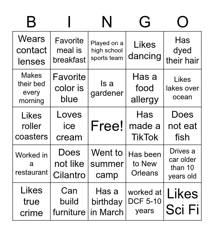 This bingo card has a free space and 29 words: Likes true crime, Watches reality TV, Loves ice cream, Can play piano, Wears contact lenses, Played on a high school sports team, Favorite color is blue, Does not like Cilantro, Has made a TikTok, Can build furniture, Does not eat fish, Likes Sci Fi, Has a birthday in March, worked at DCF 5-10 years, Likes lakes over ocean, Has broken a bone, Went to summer camp, Worked in a restaurant, Has dyed their hair, Likes roller coasters, Has been to New Orleans, Cannot ski, Has a food allergy, Makes their bed every morning, Likes dancing, Favorite meal is breakfast, Drives a car older than 10 years old, Is a gardener and Has owned a rodent or reptile.
