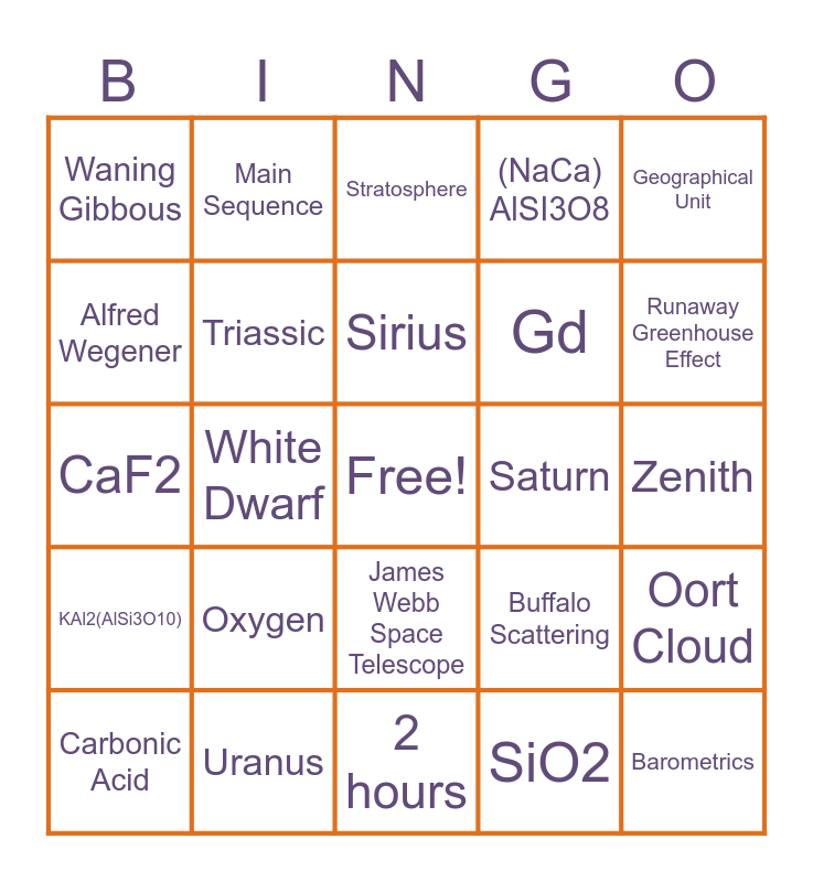 This bingo card has a free space and 203 words: 10,000 - 12,000 years ago, 1,000 - 1,200 years ago, 5,000 - 6,000 years ago, Schlurp, Whitworth Ferguson Planetarium, Donald Savage Planetarium, Au, Ag, Hg, Gd, Less, More, Sunlight Reflection, Moonlight Reflection, Earthlight Reflection, 75000 gallons, 25000 gallons, 100000 gallons, One, One Billion, 200K, Polar, Nonpolar, Jupiter, Uranus, Saturn, Neptune, Rayleigh Scattering, Buffalo Scattering, Newfane Scattering, Hydrochloric Acid, Carbonic Acid, Sulfuric Acid, Oblate spheroid, Prolate Spheroid, Hydra, Cancer, Aries, Ursa Major, Cassiopeia, Jack Hills, 4.4 bya, Lake Huron, Lake Ontario, Lake Michigan, Lake Erie, Lake Superior, Precambrian, Paleozoic, Mesozoic, Cenozoic, (NaCa) AlSI3O8, CaF2, KAl2(AlSi3O10), Titan, SiO2, Sedimentary, Igneous, Metamorphic, Geographic Information Systems, Anthracite, Bituminous, Peat, Lignite, 1885, 1985, 1785, 25 km, 16km, 11km, Shale, Slate, Alfred Wegener, Stephen Vermette, Vesicles, 3 hours, 2 hours, 24 hours, Compounds of Elements, Plastics of Legos, Dissolved salt content of a body of water, Sahlen Hotdog Content, O3, O2, O4, Mainly Silicon and Oxygen, Potassium and Argon, Iron and nickel, 20%, 97%, 2%, Wisconsinan Glacial Stage, Michigan Glacial Stage, Bronx Glacial Stage, Adirondacks, Antarctica, Gobi, Sahara, Nitrogen, Oxygen, Argon, Sirius, Polaris, Zenith, 23.5 degrees, 43 degrees, 90 degrees, Waning Gibbous, Waxing Gibbous, New Moon, Troposphere, Stratosphere, Mesosphere, Thermosphere, Muscovite and Biotite, Phlogopite, Lepidolite, Pahoehoe and A’a, Coo’s Canyon, Grand Canyon, Pirates of the Canyon, Chicxulub crater, Yucatan Crater, Lithosphere, Asthenosphere, Astronomical Unit, Metric Unit, Geographical Unit, Pacific Ocean, Atlantic Ocean, Indian Ocean, James Webb Space Telescope, Hubble Space Telescope, Einstein Probe Space Telescope, Olympus Mons, Mauna Kea, Mount Everest, Quartz and Feldspar, Pyroxene and Cobalt, Convergent, Divergent, Transform, 4.6 billion years old, 3.4 billion years old, 2024 years old, Oort Cloud, Short Cloud, Kuiper’s Cloud, Diamond, Corundum, Topaz, Quartz, Eurypterus Remipes, Sussyus Amongus, Eubrontes giganteus, Carbon, Helium, Magnesium, April 8th, 2024, April 7th, 2024, The Big Bang Theory, The Big Expansion Theory, The Outreaching Universe Theory, Eternal Flames Falls, Niagara Falls, American Falls, Astrology, Astrobiology, Astrometry, Astrophysics, Runaway Greenhouse Effect, Runaway Venus Effect, Mt. St. Helens, Mt. Rainier, Mount Spurr, Mt. St. Augustine, Invertebrate paleontology, Vertebrate paleontology, CaCO3, MgSO4, CFCl4, CCl2F2, CF4, SF6, Migmatites, Paleomagnetism, Aerodynamics, Barometrics, Thermodynamics, Paleotempestology, Paleoclimatology, Barometry, Cretaceous, Jurassic, Triassic, Main Sequence, White Dwarf, Super Giant, Bathymetry, Algology, Hydrobiology, Log-jam schist and Greenschists.