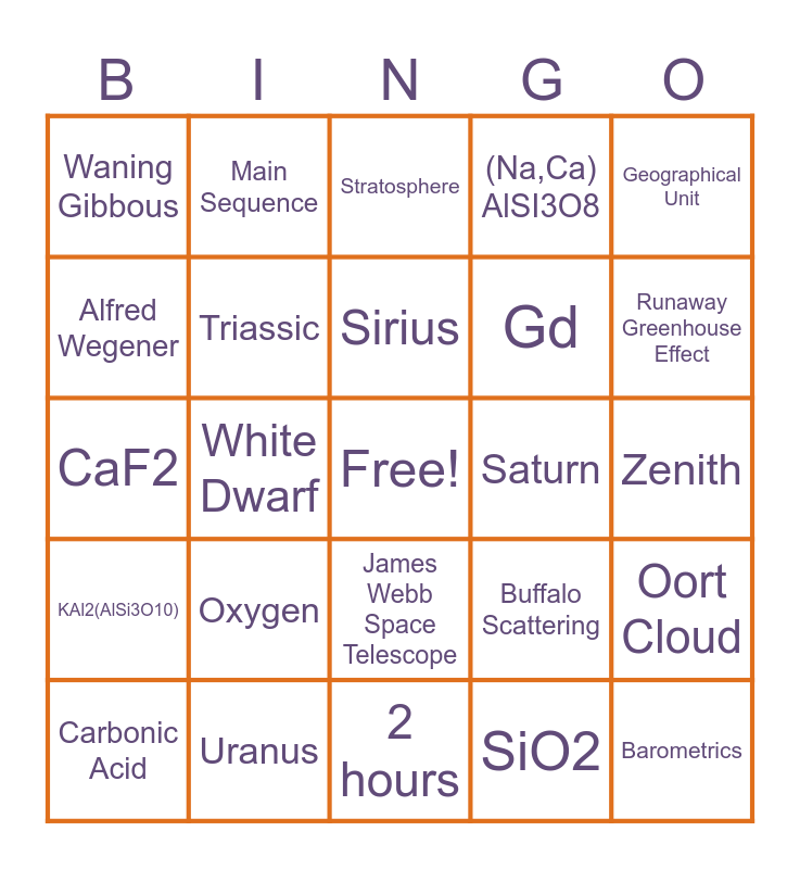 This bingo card has a free space and 203 words: 10,000 - 12,000 years ago, 1,000 - 1,200 years ago, 5,000 - 6,000 years ago, Schlurp, Whitworth Ferguson Planetarium, Donald Savage Planetarium, Au, Ag, Hg, Gd, Less, More, Sunlight Reflection, Moonlight Reflection, Earthlight Reflection, 75000 gallons, 25000 gallons, 100000 gallons, One, One Billion, 200K, Polar, Nonpolar, Jupiter, Uranus, Saturn, Neptune, Rayleigh Scattering, Buffalo Scattering, Newfane Scattering, Hydrochloric Acid, Carbonic Acid, Sulfuric Acid, Oblate spheroid, Prolate Spheroid, Hydra, Cancer, Aries, Ursa Major, Cassiopeia, Jack Hills, 4.4 bya, Lake Huron, Lake Ontario, Lake Michigan, Lake Erie, Lake Superior, Precambrian, Paleozoic, Mesozoic, Cenozoic, (Na,Ca) AlSI3O8, CaF2, KAl2(AlSi3O10), Titan, SiO2, Sedimentary, Igneous, Metamorphic, Geographic Information Systems, Anthracite, Bituminous, Peat, Lignite, 1885, 1985, 1785, 25 km, 16km, 11km, Shale, Slate, Alfred Wegener, Stephen Vermette, Vesicles, 3 hours, 2 hours, 24 hours, Compounds of Elements, Plastics of Legos, Dissolved salt content of a body of water, Sahlen Hotdog Content, O3, O2, O4, Mainly Silicon and Oxygen, Potassium and Argon, Iron and Nickel, 20%, 97%, 2%, Wisconsinan Glacial Stage, Michigan Glacial Stage, Bronx Glacial Stage, Adirondacks, Antarctica, Gobi, Sahara, Nitrogen, Oxygen, Argon, Sirius, Polaris, Zenith, 23.5 degrees, 43 degrees, 90 degrees, Waning Gibbous, Waxing Gibbous, New Moon, Troposphere, Stratosphere, Mesosphere, Thermosphere, Muscovite and Biotite, Phlogopite, Lepidolite, Pahoehoe and A’a, Coo’s Canyon, Grand Canyon, Pirates of the Canyon, Chicxulub crater, Yucatan Crater, Lithosphere, Asthenosphere, Astronomical Unit, Metric Unit, Geographical Unit, Pacific Ocean, Atlantic Ocean, Indian Ocean, James Webb Space Telescope, Hubble Space Telescope, Einstein Probe Space Telescope, Olympus Mons, Mauna Kea, Mount Everest, Quartz and Feldspar, Pyroxene and Cobalt, Convergent, Divergent, Transform, 4.6 billion years old, 3.4 billion years old, 2024 years old, Oort Cloud, Short Cloud, Kuiper’s Cloud, Diamond, Corundum, Topaz, Quartz, Eurypterus Remipes, Sussyus Amongus, Eubrontes giganteus, Carbon, Helium, Magnesium, April 8th, 2024, April 7th, 2024, The Big Bang Theory, The Big Expansion Theory, The Outreaching Universe Theory, Eternal Flames Falls, Niagara Falls, American Falls, Astrology, Astrobiology, Astrometry, Astrophysics, Runaway Greenhouse Effect, Runaway Venus Effect, Mt. St. Helens, Mt. Rainier, Mount Spurr, Mt. St. Augustine, Invertebrate paleontology, Vertebrate paleontology, CaCO3, MgSO4, CFCl4, CCl2F2, CF4, SF6, Migmatites, Paleomagnetism, Aerodynamics, Barometrics, Thermodynamics, Paleotempestology, Paleoclimatology, Barometry, Cretaceous, Jurassic, Triassic, Main Sequence, White Dwarf, Super Giant, Bathymetry, Algology, Hydrobiology, Log-jam schist and Greenschists.