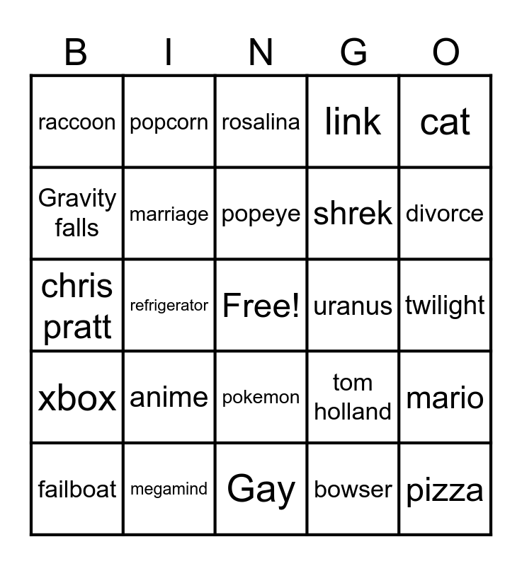 This bingo card has a free space and 24 words: failboat, anime, popeye, bowser, cat, raccoon, popcorn, rosalina, uranus, twilight, chris pratt, marriage, tom holland, mario, Gravity falls, megamind, Gay, link, divorce, xbox, refrigerator, pokemon, shrek and pizza.
