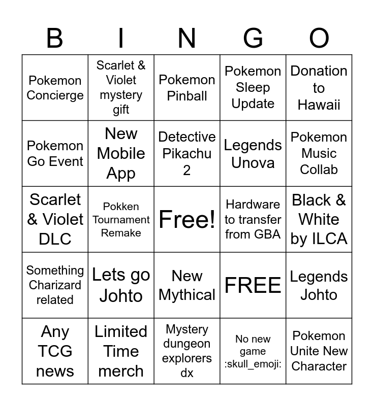 This bingo card has a free space and 25 words: Lets go Johto, Mystery dungeon explorers dx, Detective Pikachu 2, Any TCG news, Donation to Hawaii, Pokemon Concierge, Pokemon Go Event, Scarlet & Violet mystery gift, Hardware to transfer from GBA, New Mythical, Legends Unova, Scarlet & Violet DLC, FREE, Legends Johto, New Mobile App, New Animated Movie, Black & White by ILCA, Pokemon Pinball, Pokemon Music Collab, Pokken Tournament Remake, Pokemon Unite New Character, Limited Time merch, Something Charizard related, Pokemon Sleep Update and No new game :skull_emoji:.