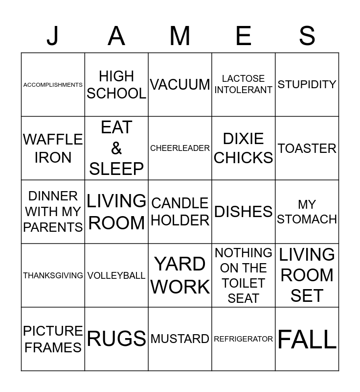 This bingo card has a free space and 24 words: VOLLEYBALL, RUGS, CHEERLEADER, PICTURE FRAMES, STUPIDITY, ACCOMPLISHMENTS, WAFFLE IRON, HIGH SCHOOL, DISHES, YARD WORK, DIXIE CHICKS, DINNER WITH MY PARENTS, NOTHING ON THE TOILET SEAT, LIVING ROOM SET, EAT & SLEEP, REFRIGERATOR, MY STOMACH, VACUUM, TOASTER, LIVING ROOM, FALL, THANKSGIVING, LACTOSE INTOLERANT and MUSTARD.