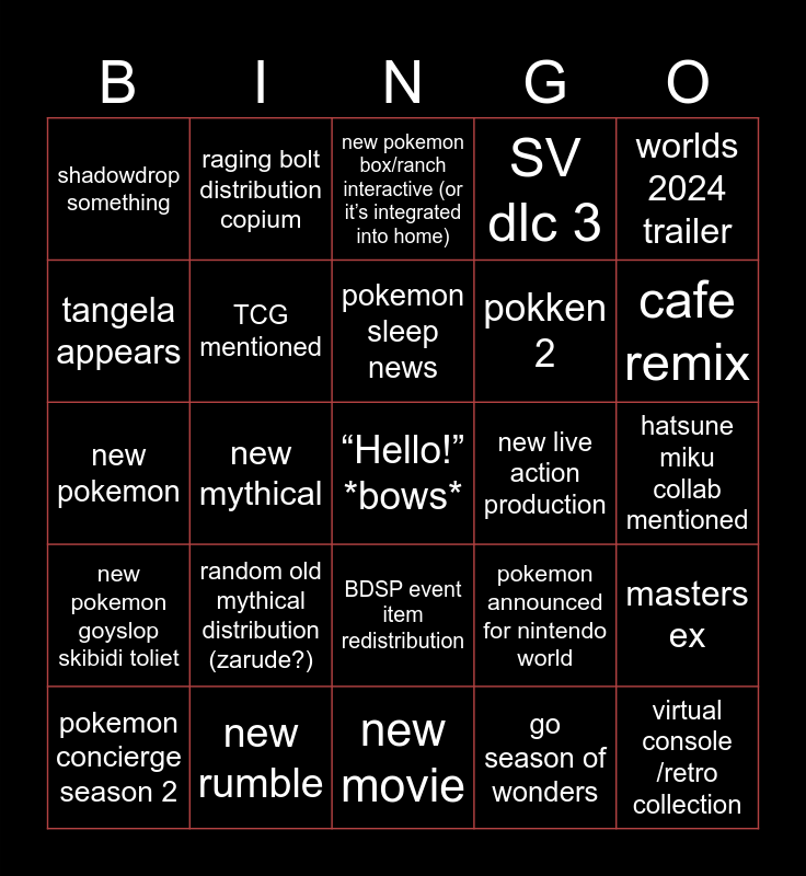 This bingo card has a free space and 24 words: pokemon concierge season 2, random old mythical distribution (zarude?), pokemon sleep news, go season of wonders, worlds 2024 trailer, shadowdrop something, raging bolt distribution copium, new pokemon box/ranch interactive (or it’s integrated into home), new live action production, hatsune miku collab mentioned, new pokemon, TCG mentioned, pokemon announced for nintendo world, masters ex, tangela appears, new rumble, new movie, SV dlc 3, cafe remix, new pokemon goyslop skibidi toliet, new mythical, BDSP event item redistribution, pokken 2 and virtual console /retro collection.