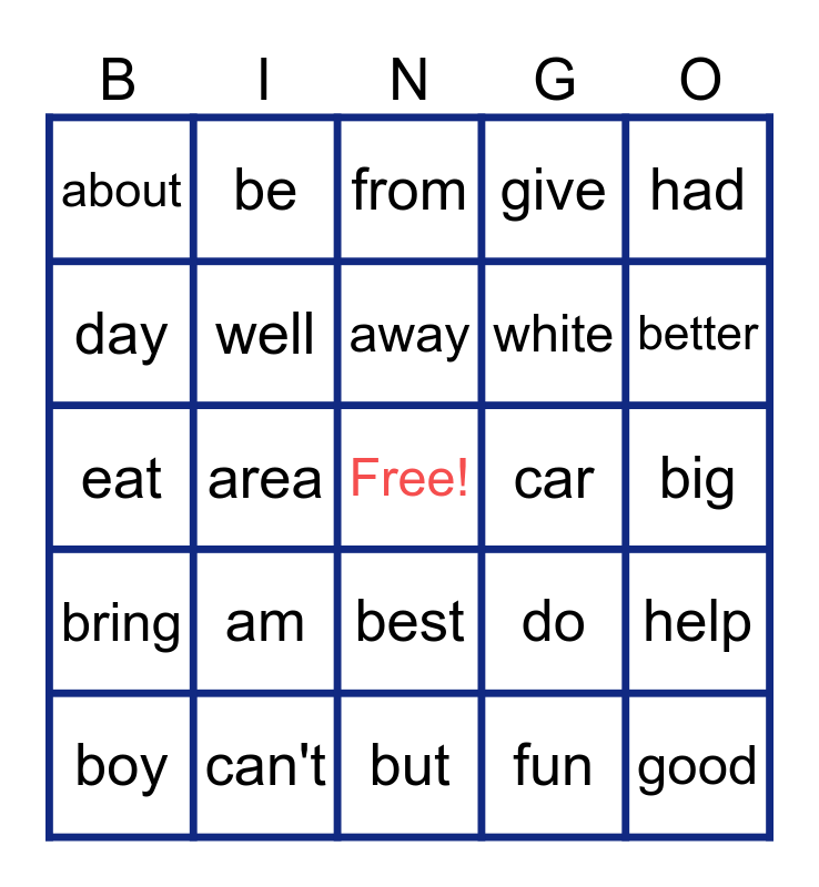 This bingo card has a free space and 24 words: am, can't, away, boy, had, about, day, be, car, best, white, eat, do, help, well, fun, big, from, better, area, good, bring, give and but.