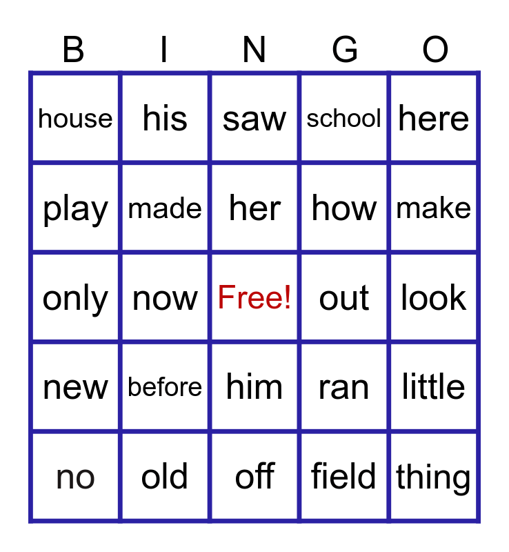This bingo card has a free space and 24 words: before, old, her, no, here, house, play, his, out, him, how, only, ran, little, made, field, look, saw, make, now, thing, new, school and off.