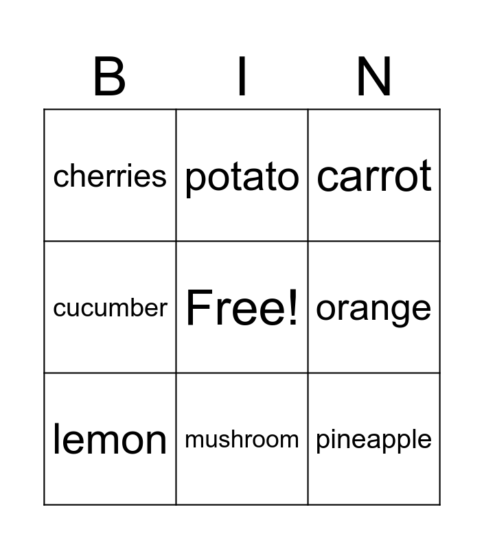 This bingo card has a free space and 17 words: apple, banana, carrot, cherries, corn, cucumber, grapes, lemon, mushroom, orange, onion, peach, pineapple, potato, pumpkin, strawberry and watermelon.