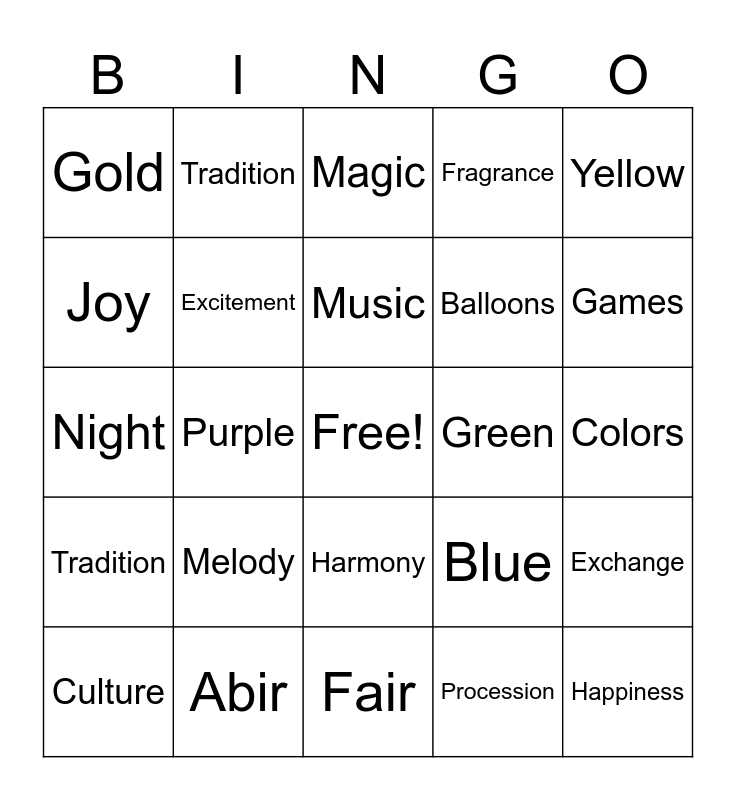 ⚠ This card has duplicate items: Festival (2), Excitement (2), Dance (2), Tradition (5)