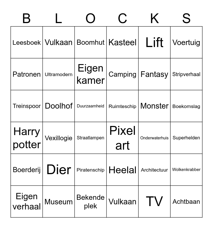 This bingo card has 40 words: Bekende plek, Fantasy, Oude Rome, Patronen, Pixel art, Boekomslag, Ultramodern, TItanic, Lift, Ruimteschip, Stripverhaal, Kasteel, Treinspoor, Duurzaamheid, Doolhof, Monster, Wolkenkrabber, Leesboek, Vulkaan, Boomhut, Vexillogie, Superhelden, Eigen kamer, Voertuig, TV, Heelal, Dier, Achtbaan, Boerderij, Piratenschip, Eenvoudig huis, Straatlampen, Eigen verhaal, Harry potter, Camping, Onderwaterhuis, Architectuur, Museum, Vulkaan and Rijksmonument.