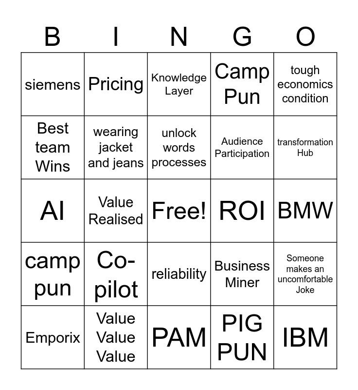 This bingo card has a free space and 34 words: can you hear me, PIG PUN, ARR, symbio, camp pun, wearing jacket and jeans, tough economics condition, Emporix, Pricing, Process BASED, unlock words processes, Knowledge Layer, hypergrowth, name mispronounced, ROI, transformation Hub, Value Value Value, AI, Co-pilot, Business Miner, reliability, Mars, siemens, BMW, PAM, IBM, Camp Pun, Slides not working, Audience Participation, Best team Wins, FISA, Value Realised, Someone makes an uncomfortable Joke and Oktoberfest.