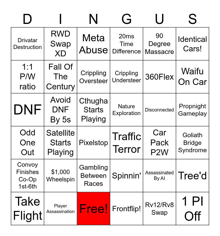 This bingo card has 39 words: Free!, Take Flight, Player Assassination, Meta Abuse, Nature Exploration, Assassinated By AI, Identical Cars!, Comeback Of The Century, Fall Of The Century, Crippling Oversteer, Crippling Understeer, Disconnected, Waifu On Car, 1:1 P/W ratio, Satellite Starts Playing, Cthugha Starts Playing, Frontflip!, 90 Degree Massacre, Goliath Bridge Syndrome, DNF, Avoid DNF By 5s, Gambling Between Races, 20ms Time Difference, Car Pack P2W, Tree'd, Odd One Out, $1,000 Wheelspin, Checkpoint!, Spinnin', 360Flex, 1 PI Off, Convoy Finishes Co-Op 1st-6th, RWD Swap XD, Pixelstop, Traffic Terror, Rv12/Rv8 Swap, Propnight Gameplay, Drivatar Destruction and Get Sat On.