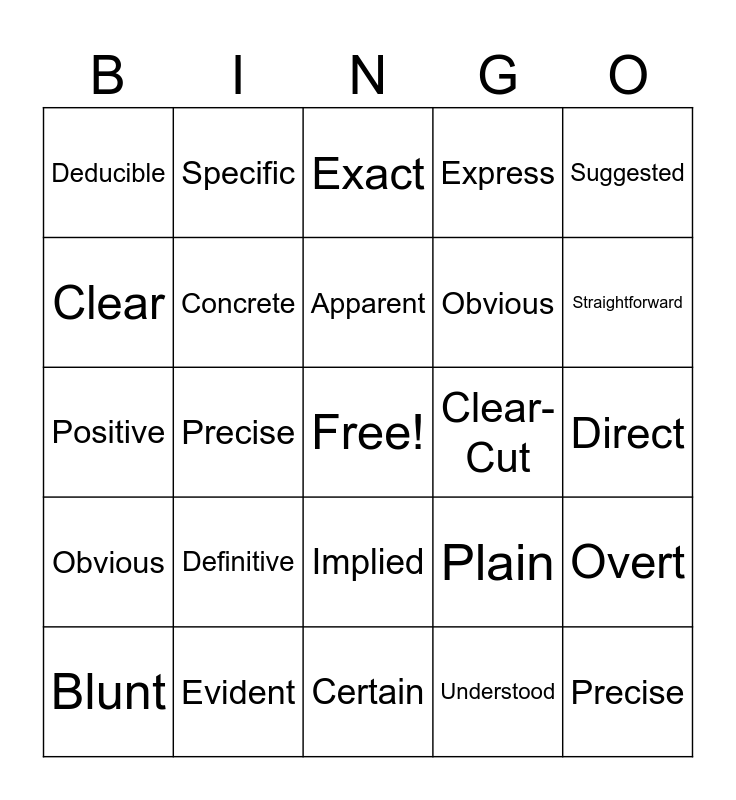 This bingo card has a free space and 26 words: Implied, Understood, Apparent, Evident, Suggested, Deducible, Clear, Specific, Direct, Plain, Obvious, Positive, Overt, Blunt, Precise, Definite, Express, Obvious, Exact, Precise, Straightforward, Certain, Clear- Cut, Definitive, Concrete and Unequivocal.