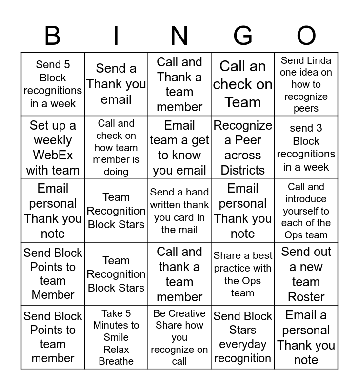 This bingo card has a free space and 24 words: Team Recognition Block Stars, Take 5 Minutes to Smile Relax Breathe, Email team a get to know you email, Send Block Points to team member, Send Linda one idea on how to recognize peers, Send 5 Block recognitions in a week, Set up a weekly WebEx with team, Send a Thank you email, Email personal Thank you note, Call and thank a team member, Recognize a Peer across Districts, Email personal Thank you note, Share a best practice with the Ops team, Send out a new team Roster, Call and check on how team member is doing, Send Block Stars everyday recognition, Call and introduce yourself to each of the Ops team, Call and Thank a team member, send 3 Block recognitions in a week, Team Recognition Block Stars, Email a personal Thank you note, Send Block Points to team Member, Call an check on Team and Be Creative Share how you recognize on call.