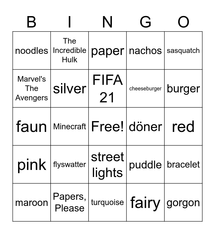 This bingo card has a free space and 25 words: flyswatter, turquoise, FIFA 21, maroon, sasquatch, noodles, Marvel's The Avengers, The Incredible Hulk, döner, street lights, cheeseburger, faun, puddle, bracelet, silver, valkyrie, red, paper, burger, Minecraft, gorgon, Papers, Please, pink, nachos and fairy.