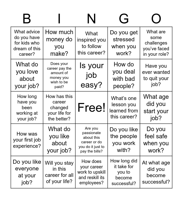 This bingo card has a free space and 30 words: Will you stay in this career for all of your life?, Will you teach your children (if you have any) about this career?, How has this career changed your life for the better?, Did you ever think that you would have this career?, What advice do you have for kids who dream of this career?, What inspired you to follow this career?, Does your career pay the amount of money you wish to be paid?, Are you passionate about this career or do you do it just to pay the bills?, What’s one lesson you learned from this career?, How does your career work to upskill and reskill its employees?, What age did you start your job?, At what age did you become successful?, How long did it take for you to become successful?, Is your job hard?, Have you ever wanted to quit your job?, Have you ever felt the need to give up?, Do you like the people you work with?, How was your first job experience?, What do you like about your job?, What are some challenges you’ve faced in your role?, How long have you been working at your job?, Do you like your co-workers?, How much money do you make?, How do you deal with bad people?, What do you love about your job?, Do you get stressed when you work?, Do you feel safe when you work?, Do you like everyone at your job?, Is your job easy? and How many jobs did you have to go through to get to where you are?.