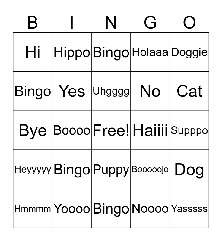 This bingo card has a free space and 24 words: Bingo, Yoooo, Uhgggg, Hmmmm, Doggie, Hi, Bingo, Hippo, Haiiii, Puppy, No, Bye, Booooojo, Dog, Yes, Noooo, Supppo, Bingo, Cat, Boooo, Yasssss, Heyyyyy, Holaaa and Bingo.