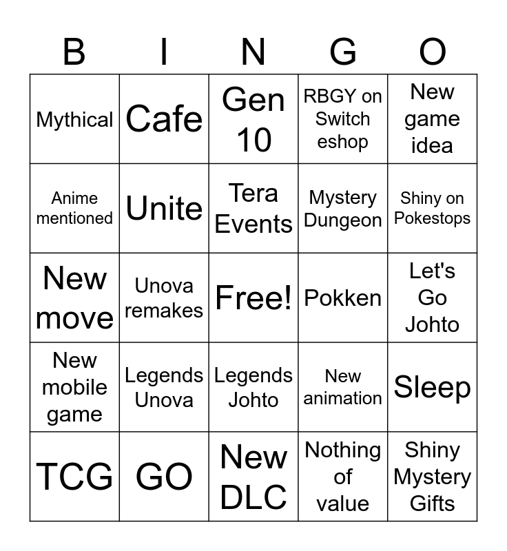 This bingo card has a free space and 24 words: Legends Unova, GO, Tera Events, TCG, New game idea, Mythical, Anime mentioned, Cafe, Pokken, Legends Johto, Mystery Dungeon, New move, New animation, Sleep, Unite, Nothing of value, Let's Go Johto, Gen 10, Shiny on Pokestops, Unova remakes, Shiny Mystery Gifts, New mobile game, RBGY on Switch eshop and New DLC.