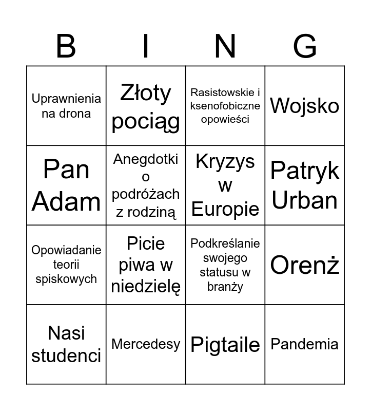 This bingo card has 16 words: Mercedesy, Orenż, Rasistowskie i ksenofobiczne opowieści, Uprawnienia na drona, Opowiadanie teorii spiskowych, Złoty pociąg, Podkreślanie swojego statusu w branży, Pigtaile, Pan Adam, Anegdotki o podróżach z rodziną, Nasi studenci, Wojsko, Picie piwa w niedzielę, Patryk Urban, Kryzys w Europie and Pandemia.