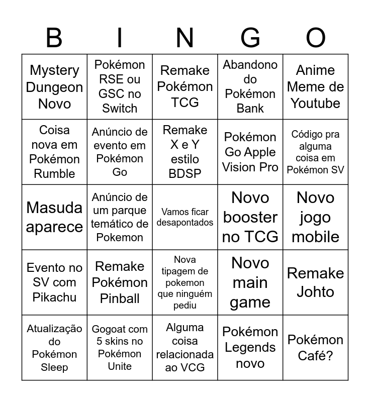 This bingo card has a free space and 24 words: Remake Pokémon Pinball, Gogoat com 5 skins no Pokémon Unite, Remake X e Y estilo BDSP, Atualização do Pokémon Sleep, Anime Meme de Youtube, Mystery Dungeon Novo, Coisa nova em Pokémon Rumble, Pokémon RSE ou GSC no Switch, Novo booster no TCG, Nova tipagem de pokemon que ninguém pediu, Pokémon Go Apple Vision Pro, Masuda aparece, Novo main game, Remake Johto, Anúncio de evento em Pokémon Go, Pokémon Legends novo, Novo jogo mobile, Remake Pokémon TCG, Código pra alguma coisa em Pokémon SV, Anúncio de um parque temático de Pokemon, Pokémon Café?, Evento no SV com Pikachu, Abandono do Pokémon Bank and Alguma coisa relacionada ao VCG.