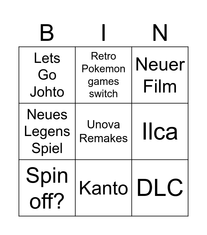 This bingo card has a free space and 8 words: Ilca, Neuer Film, Retro Pokemon games switch, Spin off?, Lets Go Johto, DLC, Neues Legens Spiel and Kanto.