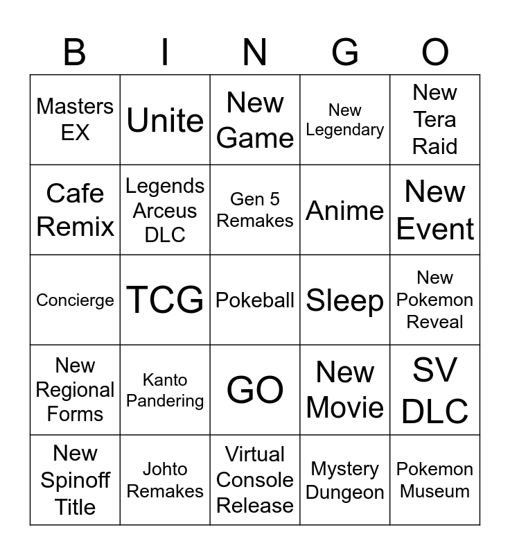 This bingo card has a free space and 24 words: Kanto Pandering, Johto Remakes, Gen 5 Remakes, New Spinoff Title, New Tera Raid, Masters EX, Cafe Remix, Unite, Sleep, GO, Anime, Concierge, New Movie, SV DLC, Legends Arceus DLC, Mystery Dungeon, New Pokemon Reveal, New Game, New Event, TCG, Pokemon Museum, New Regional Forms, New Legendary and Virtual Console Release.