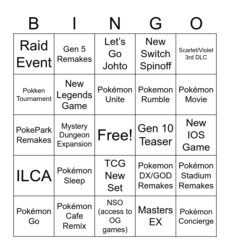 This bingo card has a free space and 24 words: Pokémon Sleep, Pokémon Cafe Remix, Pokémon Unite, Pokémon Go, Scarlet/Violet 3rd DLC, Raid Event, Pokken Tournament, Gen 5 Remakes, Gen 10 Teaser, TCG New Set, Pokemon Rumble, PokePark Remakes, Pokemon DX/GOD Remakes, Pokémon Stadium Remakes, New Legends Game, Masters EX, New IOS Game, Let’s Go Johto, Pokémon Movie, Mystery Dungeon Expansion, Pokémon Concierge, ILCA, New Switch Spinoff and NSO (access to OG games).