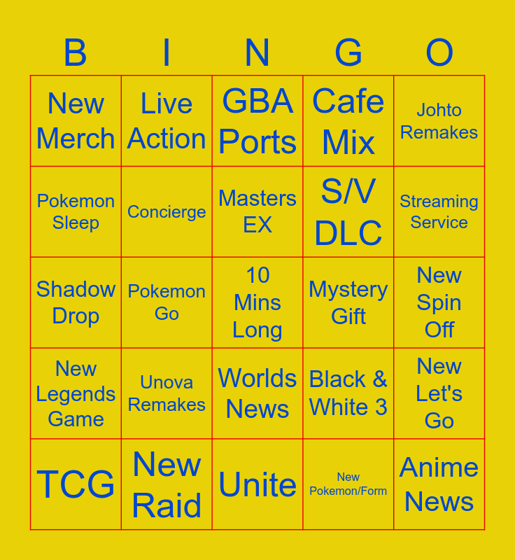This bingo card has a free space and 24 words: Unova Remakes, New Raid, Masters EX, TCG, Johto Remakes, New Merch, Pokemon Sleep, Live Action, Mystery Gift, Worlds News, S/V DLC, Shadow Drop, Black & White 3, New Let's Go, Concierge, New Pokemon/Form, New Spin Off, GBA Ports, Streaming Service, Pokemon Go, Anime News, New Legends Game, Cafe Mix and Unite.