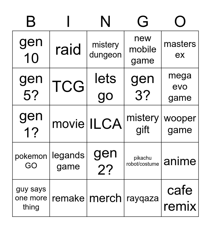 This bingo card has a free space and 24 words: legands game, remake, lets go, guy says one more thing, masters ex, gen 10, gen 5?, raid, mistery gift, gen 2?, gen 3?, gen 1?, pikachu robot/costume, anime, TCG, rayqaza, wooper game, mistery dungeon, mega evo game, movie, cafe remix, pokemon GO, new mobile game and merch.