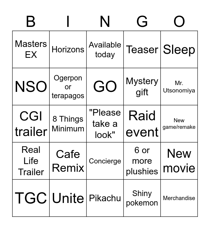 This bingo card has a free space and 24 words: Cafe Remix, Unite, GO, TGC, Sleep, Masters EX, NSO, Horizons, Raid event, Concierge, Mystery gift, CGI trailer, 6 or more plushies, New movie, Ogerpon or terapagos, Shiny pokemon, New game/remake, Available today, Mr. Utsonomiya, 8 Things Minimum, Merchandise, Real Life Trailer, Teaser and Pikachu.
