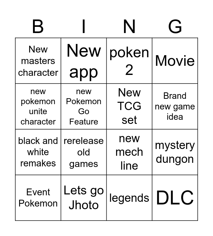 This bingo card has 16 words: Lets go Jhoto, mystery dungon, poken 2, New masters character, black and white remakes, New app, new mech line, legends, new pokemon unite character, new Pokemon Go Feature, Event Pokemon, Movie, rerelease old games, Brand new game idea, New TCG set and DLC.