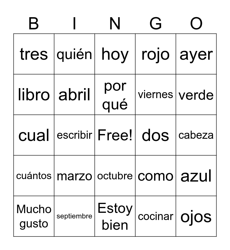 This bingo card has a free space and 93 words: Hola, Como estas, Estoy bien, Como se llama, Me llamo, Cuantos anos tienes, Me gusta, Mucho gusto, domingo, lunes, martes, miercoles, jueves, viernes, sábado, ayer, hoy, mañana, semana, día, mes, año, enero, febrero, marzo, abril, mayo, junio, julio, agosto, septiembre, octubre, noviembre, diciembre, quién, qué, cuando, dónde, por qué, como, cual, cuántos, cabeza, cuerpo, ojos, oreja, boca, nariz, brazos, piernas, pie, cocinar, escuchar, dibujar, deportes, comida, cuentos, jugar, pintar, bailar, escribir, música, artista, voz, danza, bailar, teatro, público, libro, escritor, poema, actor, arte, rojo, naranja, amarillo, verde, azul, morado, negro, blanco, uno, dos, tres, cuatro, cinco, seis, siete, ocho, nueve, diez, quince and veinte.
