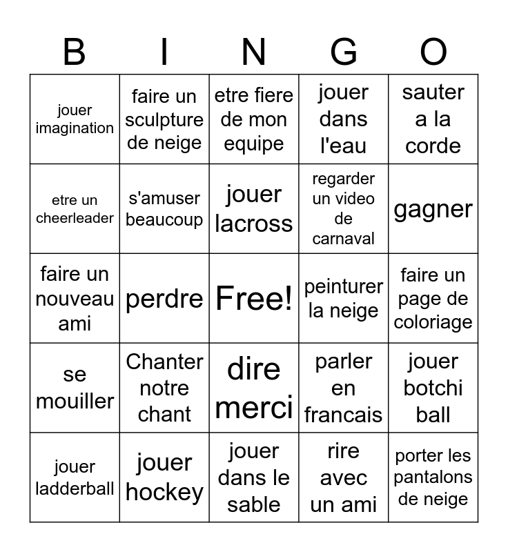 This bingo card has a free space and 24 words: Chanter notre chant, jouer hockey, jouer lacross, jouer ladderball, sauter a la corde, jouer imagination, etre un cheerleader, faire un sculpture de neige, peinturer la neige, dire merci, regarder un video de carnaval, faire un nouveau ami, parler en francais, jouer botchi ball, s'amuser beaucoup, rire avec un ami, faire un page de coloriage, etre fiere de mon equipe, gagner, perdre, porter les pantalons de neige, se mouiller, jouer dans l'eau and jouer dans le sable.