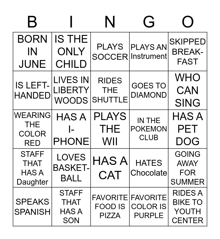 This bingo card has a free space and 24 words: LOVES BASKET- BALL, STAFF THAT HAS A SON, RIDES THE SHUTTLE, SPEAKS SPANISH, SKIPPED BREAK- FAST, BORN IN JUNE, IS LEFT- HANDED, IS THE ONLY CHILD, IN THE POKEMON CLUB, HAS A CAT, GOES TO DIAMOND, WEARING THE COLOR RED, HATES Chocolate, GOING AWAY FOR SUMMER, LIVES IN LIBERTY WOODS, FAVORITE COLOR IS PURPLE, HAS A PET DOG, PLAYS SOCCER, WHO CAN SING, HAS A I-PHONE, RIDES A BIKE TO YOUTH CENTER, STAFF THAT HAS A Daughter, PLAYS AN Instrument and FAVORITE FOOD IS PIZZA.